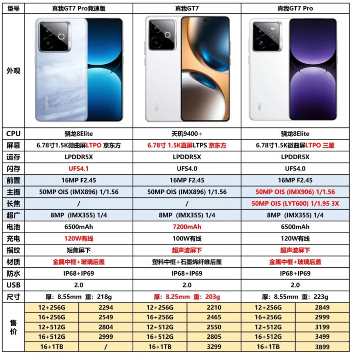 从去年年底到目前,@真我手机 陆续带来了真我GT7系列的三款旗舰机型,其中包括标准版、Pro竞速版和Pro版,从官方公布的数据可以看到,三款新机的机身越来越轻薄,但电池容量却越来越大,性能优化也越来越极致,性价比也越来越高。那么,这三款机型都有哪些区别?该怎么选呢?希望下文能对感兴趣的小伙伴有所帮助。