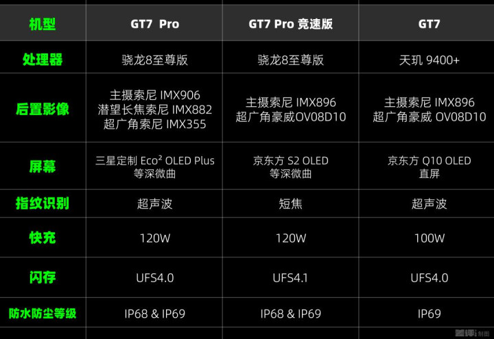 三款机型都支持IP68/IP69顶级防尘防水,此外,真我GT7 Pro和真我GT7配备的都是超声波指纹解锁,完全无惧手上沾水或有污渍,真我GT7 Pro竞速版则采用的是短焦屏幕指纹解锁。在机身材质方面,真我GT7 Pro和真我GT7 Pro竞速版都采用的是金属中框+玻璃机身,而真我GT7的机身材质则是塑料中框+石墨烯纤维材质,据介绍,这一材质更有助于散热。真我GT7 Pro和真我GT7 Pro竞速版都采用的是120W有线快充,真我GT7则采用的是100W有线快充。