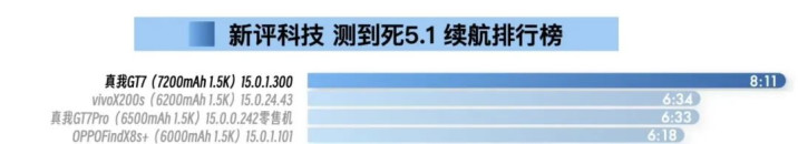 不过,前两款机型的电池容量都为6500mAh,最轻薄的真我GT7的电池容量则增加到了7000mAh,也就是说理论上,该机的续航应该更强,上手操控体验应该更舒适。从目前的测试数据看,真我GT7的续航领先GT7 Pro约98 分钟,续航提升了近25%。